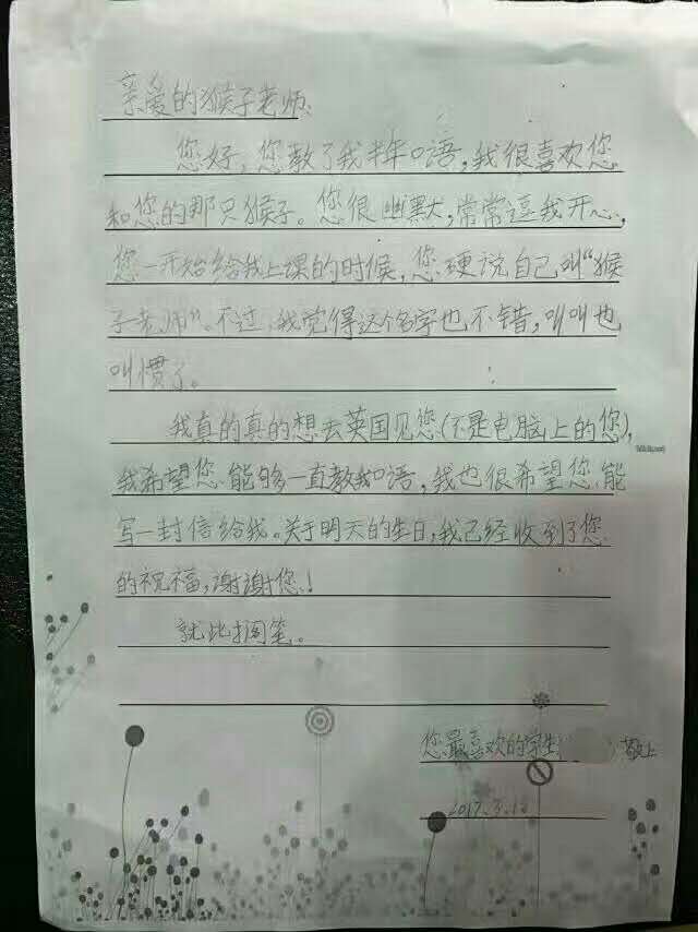 在hellokid長(zhǎng)期學(xué)習(xí)的學(xué)生,對(duì)收到了外教老師的生日祝福表示感謝,寫(xiě)信讓媽媽拍下來(lái)給hellokid的課程顧問(wèn),然后由相關(guān)的工作人員翻譯轉(zhuǎn)達(dá)給老師。外教老師得知后非常感動(dòng)。