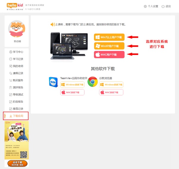 在Hellokid在線少兒英語官網(wǎng)進(jìn)行登錄進(jìn)入學(xué)習(xí)中心,點擊左側(cè)欄目“下載應(yīng)用”,選擇對應(yīng)系統(tǒng)進(jìn)行下載。